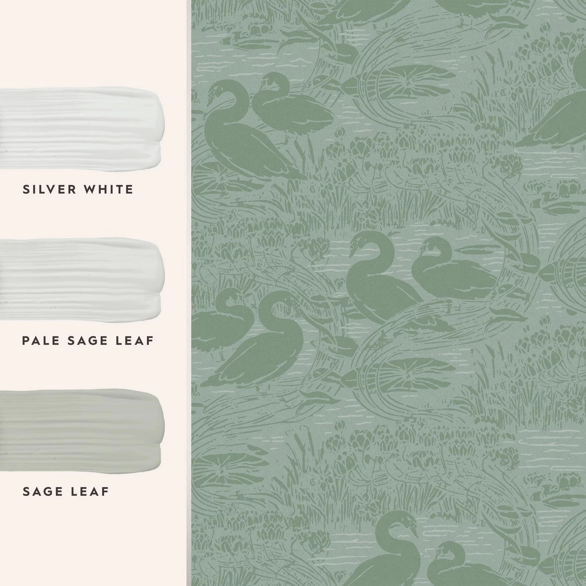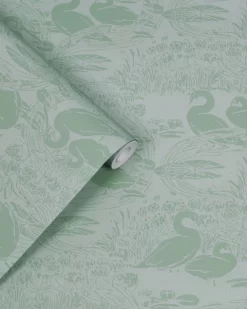 Inspired by a beautiful antique painted artwork of swans gliding across the water, Swans Wallpaper is perfect for creating a serene feel to any room. The bold jade green colorway showcases these dainty animals in a lush landscape. Pair with colorful accessories to add a burst of fun or tone it down with neutrals for a true country chic look.