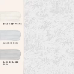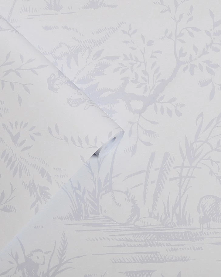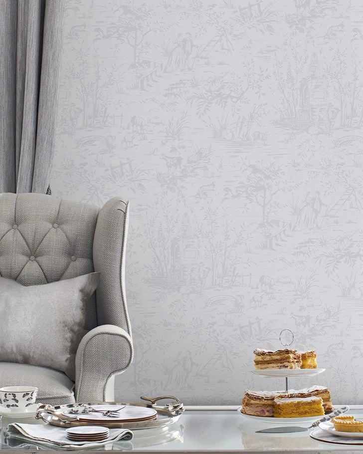 Toile de Jouy is an antique print found in the Laura Ashley archive. French and romantic, this extravagant monotonal print is classic and detailed, featuring a picturesque landscape design. The sugared grey colorway allows this wallpaper to add subtle depth to your walls.