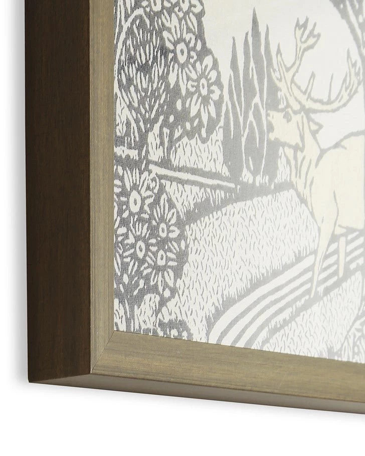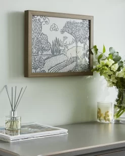 Bring the freshness of nature into your home with the Trecastle wall art. This quirky framed print features an arts and crafts block inspired Stag design in a landscape of trees and grass. This artwork will serve as a lovely addition to any room.