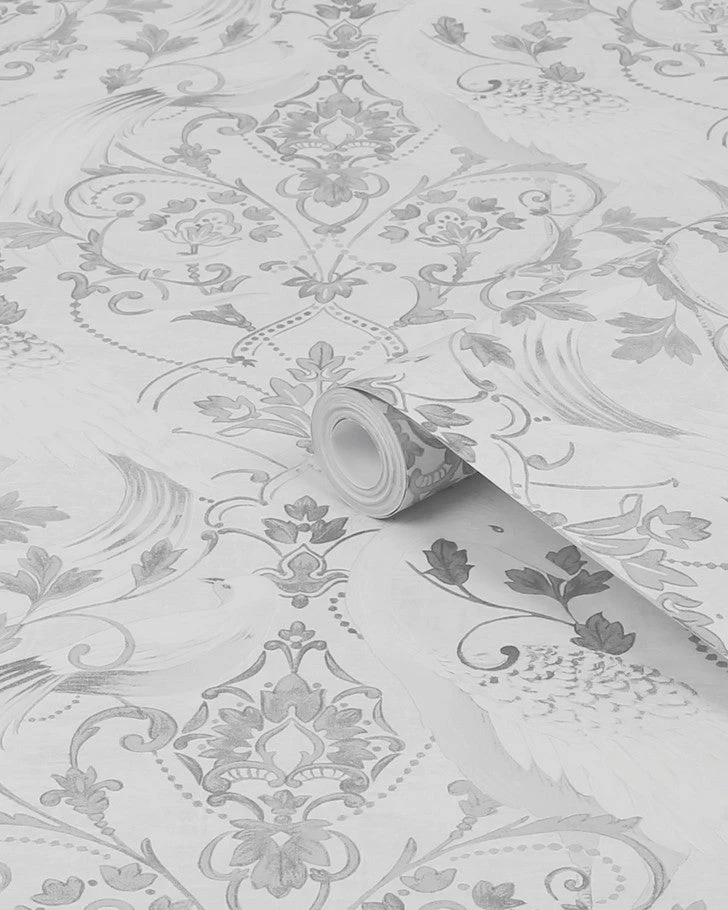 This romantic damask print was inspired by French classical tonal designs. The Tregaron wallpaper features beaded swags, scrolling stylised leaves and flowers, surrounded by cranes forming undulating curve shapes with fanned feathery tails. This wallpaper is perfect for creating a chic and elegant statement wall in your interior.