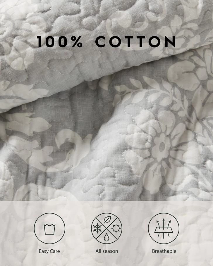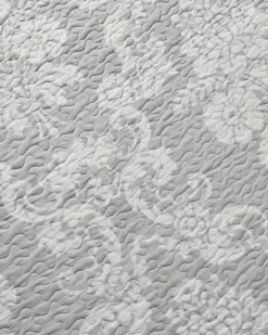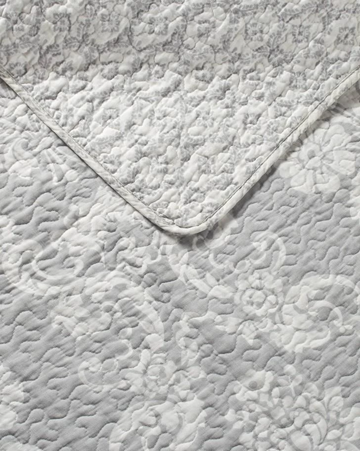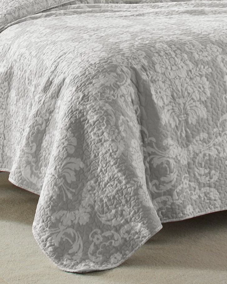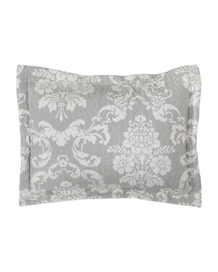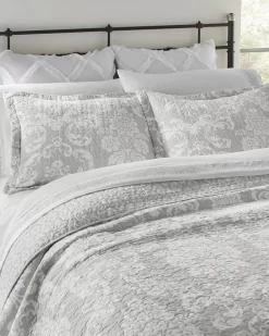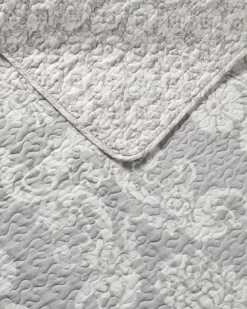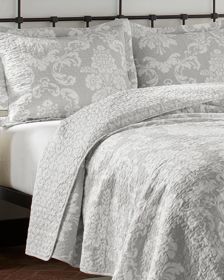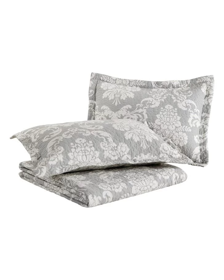 The Laura Ashley Venetia Grey quilt set features a classic damask design, in a calm neutral palette of grey and white. A large damask print stretches over the face of the quilt with a small-scale lattice scroll print reverse. Quilt set includes one quilt and two shams (twin set includes one sham).Â