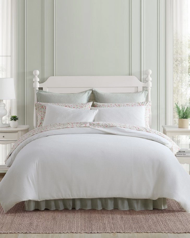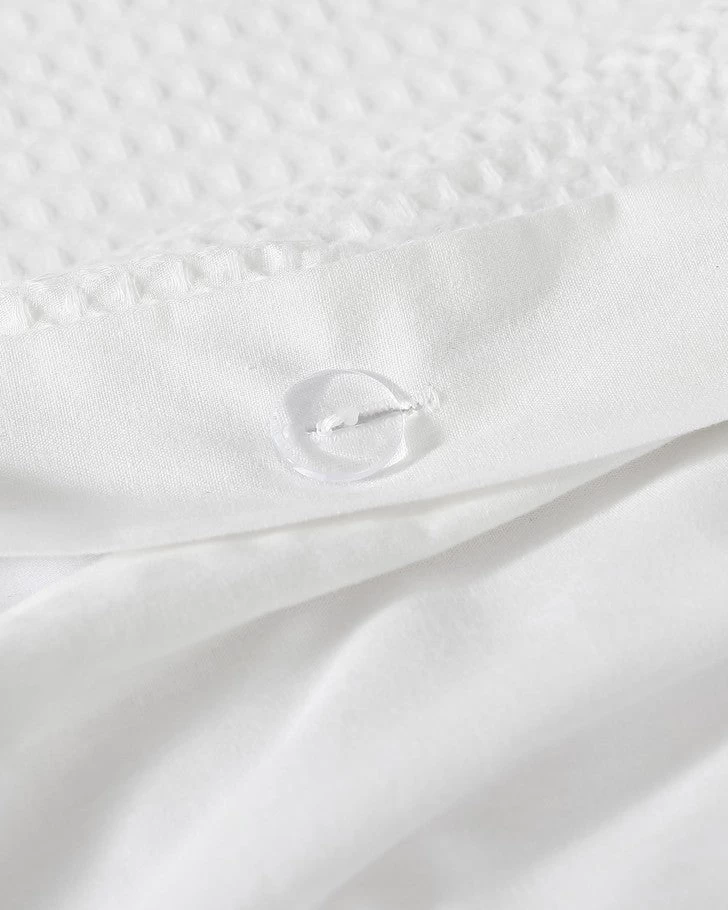 Woven in the softest cotton for a luxurious feel, the Laura Ashley Waffle Pique duvet cover set is a simple, yet stylish addition to any bedroom. This breathable bedding is perfect for year round use. The duvet cover features bottom button closures with four additional inner corner ties. Shams feature an easy envelope closure. Set includes one duvet cover and two shams. OEKO-TEX Standard 100 Certified: This product has been tested to be safe and free from harmful chemicals.