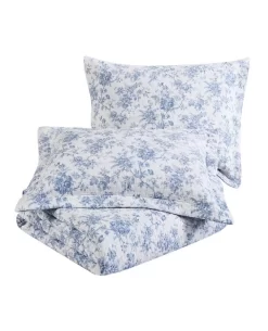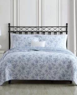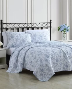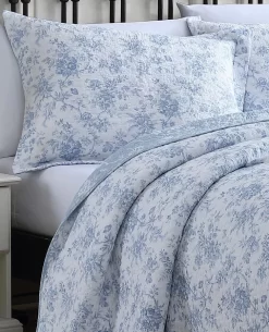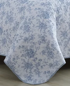 Bring new life to your bedroom decor with the Walled Garden Quilt Set from Laura Ashley. This refreshing all-cotton set combines stunning shades of blue in a floral toile pattern that is printed continuously allover a crisp white ground. Reversing to a smaller scale floral pattern in white on a light blue ground, this set is perfect for creating versatile bedroom looks. Use as a layering piece with your current bedding or as a stand-alone piece in the warmer months. The quilt features a polyester/cotton blended fill and is machine washable for easy care. Set includes: one quilt, two shams (twin size includes one sham)