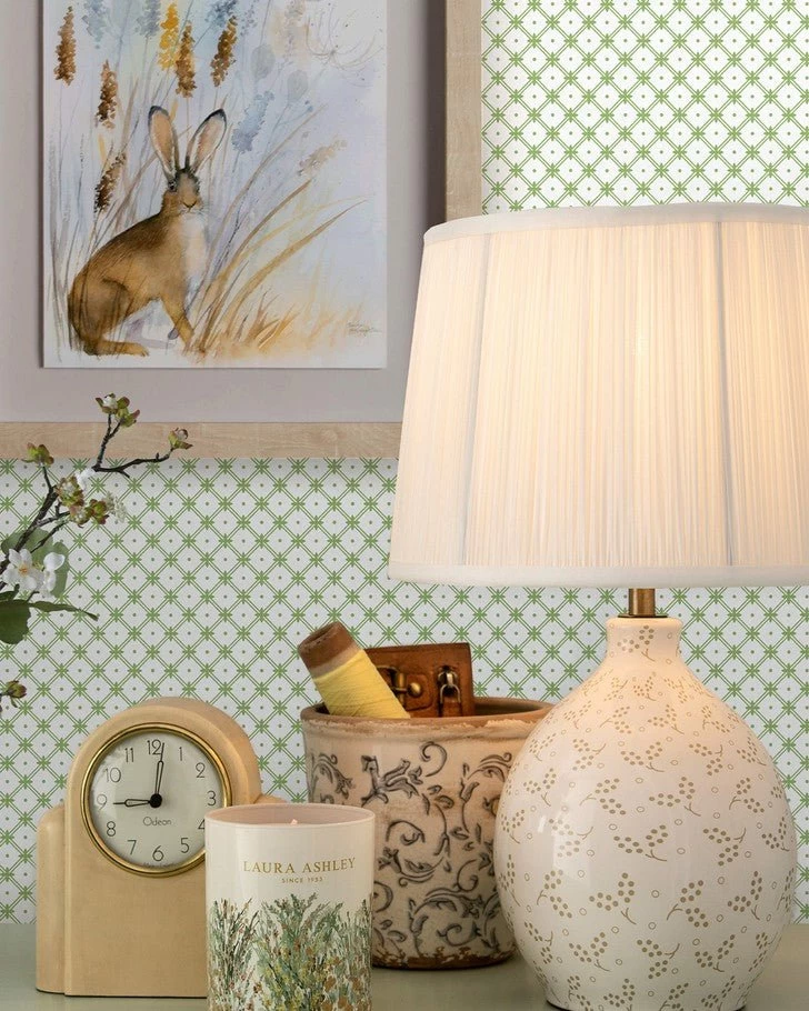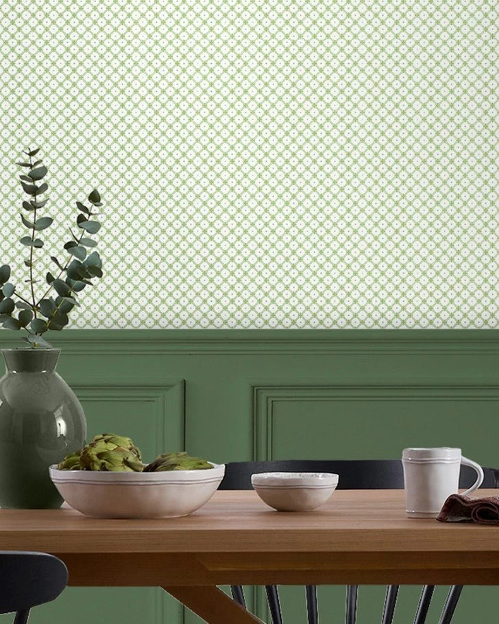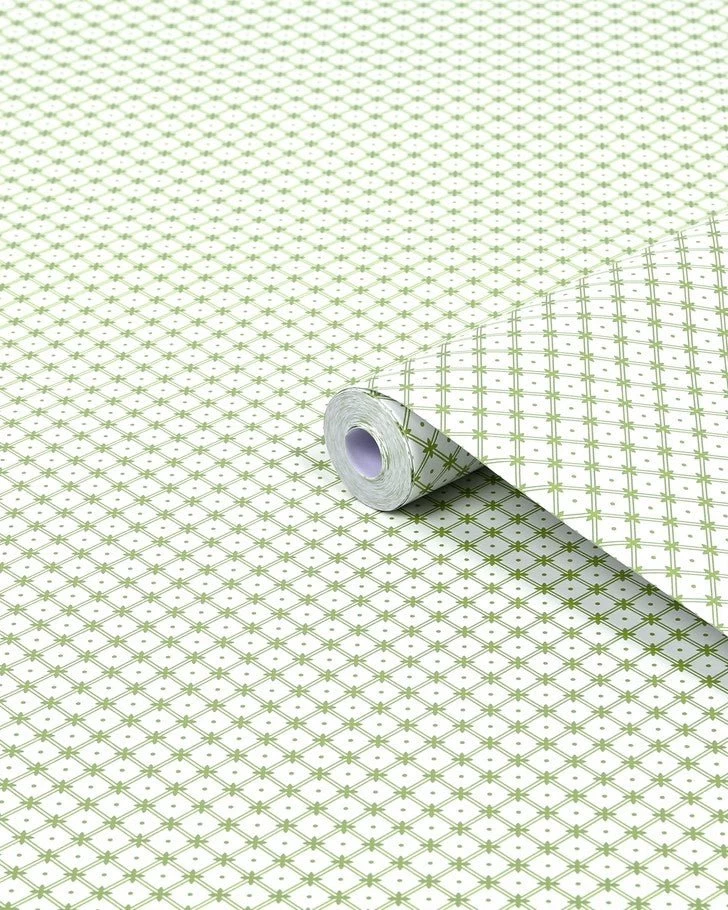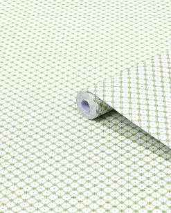 Timelessly elegant, Wickerwork wallpaper is a small-scale geometric print. Featuring a double-lined lattice pattern joined by a cross shape, this paper is subtle enough for all four walls. Designed in complementing tones of green, this paper coordinates well with many shades of decor.