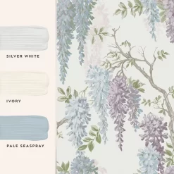 Bring a delicate and serene feel to your interior with this fabulous redesign of a Laura Ashley favorite. The Wisteria wallpaper features softly trailing branches on a cream background. This design has flowers in shades of pink, purple and blue.